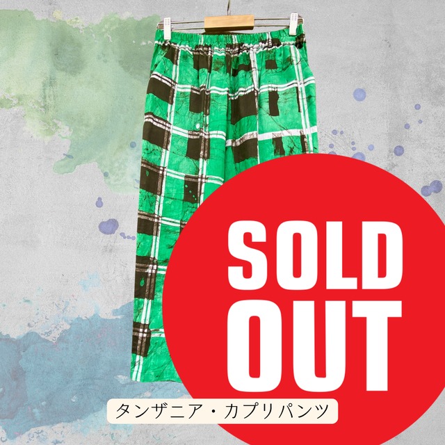 く◆タンザニア手染めバティックを使った1枚だけのカプリパンツ◆ ハイウエストで座ったときもアンダーウエアが見えてしまうような事が無い安心デザイン。ゴムと紐のウエストで、幅広いサイズに対応しています。また、全体的にゆったりとしたフォルムで夏の暑い時期にはサラリと、冬はレギンスやタイツと合わせてと一年中楽しめます。 裾は、スリットを短めに入れることで膝が出にくいようにしてあります。 すっきりとしたシルエットですが、タンザニアのバティックの図案と色使いが合わさる事で個性を感じる一着に仕上がります。 使用しているバティックは、ひとつひとつ丁寧にアフリカのタンザニアで染付けしています。同じ図案でも手染めなので、同じものがなく正に世界に一つの生地になっています。 このアフリカの大地が生み出す大胆な文様をもつ生地には、オトナ女性にぴったりの仕上がりになります。遊び心のある貴方だけの一品になると思います。 素材はコットン100%で洗うたびに柔らかくなり、一度着てしまうとやめられない着心地の良さが自慢です。 ・・・・・ 【サイズ】フリーサイズ(ウエストギャザー:ゴム) 【仕上がり寸法】ウエスト 74cm、ヒップ 114cm、丈80cm 【素材構成】コットン100% 【その他】ポケット両サイド、ウエスト1㎝巾紐つき、脇裾スリット ●サイズは、計り方で若干の差が生じます。 ●オンラインショップ上では、色合いが微妙に違って見えます。なるべく、表現できるように調整しておりますが、ご考慮頂けると幸いです。 ・・・・・